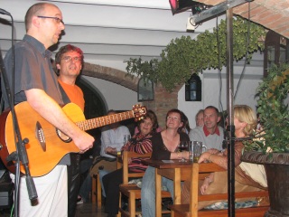 | Wer "Wellness" nur mit dampfenden Bädern, Gurkenmasken oder Heilkräutertees in Verbindung bringt, ist eindeutig schief gewickelt. Spätestens nach dem Besuch eines Auftrittes von "boss" (kurz für "brucig Ogrichte singa Songs") wird Entspannungssuchenden klar: im Oberpfälzer Idiom liegt die wahre Rettung für stressgeplagte Geister. Wenn Hubert Treml und Franz Schuier in ihrer heimischen Mundart Lieder von Bruce Springsteen zum Besten geben, dann ist das Seelenmassage, Relax-Packung und Zwerchfellgymnastik in einem. Schon die Begrüßung in der Zechstube beim Rockermeier wurde zur Lockerungsübung und nach wenigen Minuten sang, lachte und klatschte das Publikum mit. | ![]() |