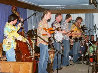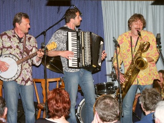 Die rhythmische Lokomotive, der offensichtlich nie der Atem ausgeht, ist Johann Bengen, auch "BangBang" genannt · in Anlehnung an seine Neigung alles zum Schlagzeug zu verwandeln, was nicht fliehen kann. Faszinierend wie er im Zehntelsekundentakt hämmert, kratzt und schleift und dabei mit einem Rotweinglas akustische Wunder vollbringt. Als Sonnyboy der Truppe, der mit verschmitztem Humor meist für die Überleitungen zuständig ist, ist Josef Brustmann auch an Tuba, Zither und Banjo ein Glücksgriff. Selbst eine alternde Bachtrompete verführt er zu modernen Klängen. |