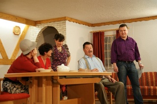 Es ist schon ein Kreuz mit dem starken Geschlecht, in dem pro Exemplar erfahrungsgemäß "a hoiberts Riendviech" steckt. Davon kann die Babette Tratschmoser ein Lied singen. Überzeugend gespielt von Monika Zellner, sorgt diese vermeintlich wohlwollende Nachbarin hochnäsig, eingebildet und energiegeladen für Unruhe im Hause Karpfinger. Schließlich möchte sie ihre Tochter Rosalinde (Sylvia Fischer herrlich "dappig" als gutmütige Dodschn) an den Junior bringen. Der Steffl allerdings (augenzwinkernd und humorvoll: Manfred Meixensberger) hat schon eine andere im Auge. | ![]() |