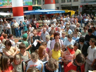 Nicht ganz an den Erfolg des Vorjahres konnte der "Hamburger Fischmarkt", der am Wochenende in Geisenfeld gastierte, anknüpfen. Zwar zeigte sich Veranstalter Herbert Jungmann "unterm Strich zufrieden", ebenso wie die Organisatoren von der Werbegemeinschaft Leonhard Milchmeier und Robert Heinzlmeier. Die Profi-Marktschreier schätzen das Besucheraufkommen auf zirka 13 000, etwa 7 000 weniger als 2003. Schuld sei hier in erster Linie das schwül-heiße Wetter, das die Leute eher zum Baden als zum Bummeln verleitet habe, so Jungmann gegenüber der GZ. Richtig gut sei das Geschäft in erster Linie am Freitagabend gelaufen · da waren am Ende sogar die Sitzplätze knapp. |