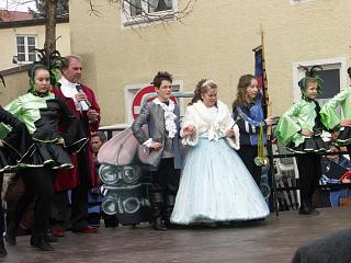 Das Geheimnis, wer denn nun heuer das Zepter bei der Kindergarde übernimmt, wurde dann in einer aufwändigen Zeremonie mit "Henry-Maske-Musik", Trockeneis-Nebelschwaden und riesigem Transparent gelüftet. Die neunjährige Grundschülerin Alina und ihr Prinz, der elfjährige Realschüler Pascal, wurden natürlich mit rauschendem Beifall willkommen geheißen, und nachdem die neue Prinzessin von ihre Vorgängerin Kathrin "gekrönt" worden war, stand als erste Amtshandlung des neuen Paares der Prinzenwalzer auf dem Programm. |