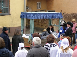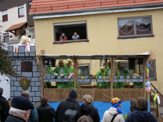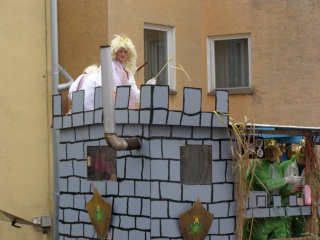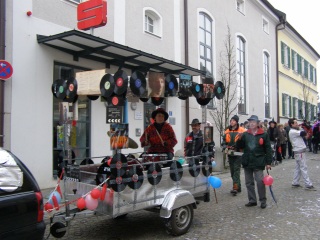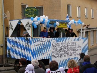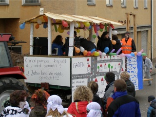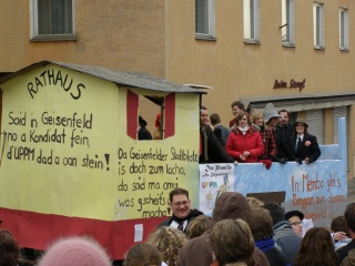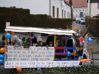 | An der Stadtplatzkreuzung werden wieder Hans König und Ralf Maul den Gaudiwurm von einem Baugerüst herunter kommentieren und die Mottos der einzelnen Wagen näher erläutern. Ausdrücklich wies der GFG-Präsident in der Sitzung darauf hin, dass der Faschingszug nicht für Wahlkampfzwecke missbraucht werden dürfe. Natürlich sollten auch kommunalpolitische Themen aufs Korn genommen werden, ich will aber auf keinem der Wagen ein Wahlplakat sehen. | ![]() |